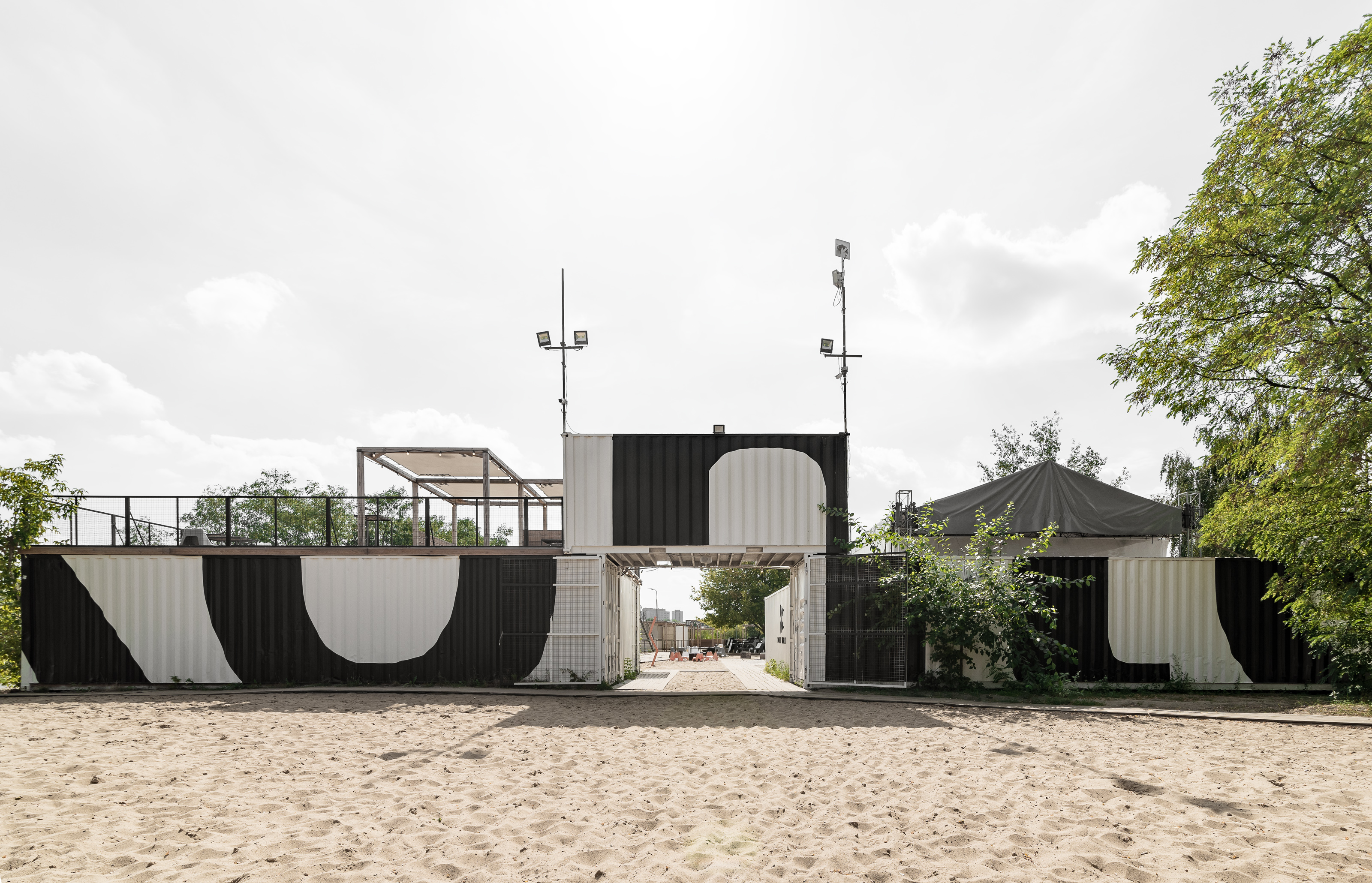 wiercinski-studio recycles 23 shipping containers to build a cultural center by the river in Poznan.